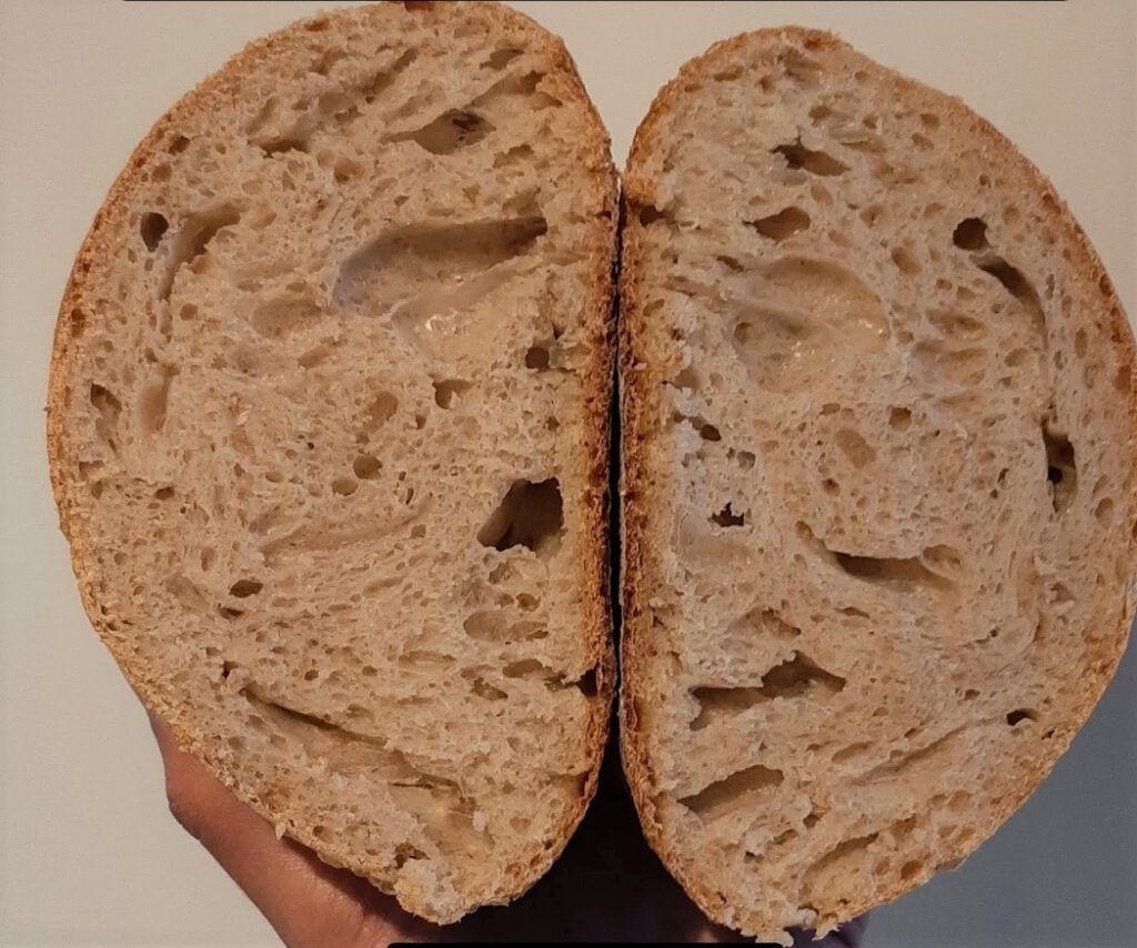 Als je een 100% speltbrood wilt bakken dan moet je uiteraard ook een speltdesem gebruiken, anders is het geen 100% spelt! Dus als eerste begon ik met het starten van een speltdesem. Hiervoor gebruik ik de T100 van Kollenberger spelt, lokaal geteeld én gemalen volkoren speltmeel. Na ruim een week was het desem klaar voor gebruik. Om te starten gebruikte ik een mix van 80% speltbloem en 20% volkoren speltmeel. Samen met een 78% water werd er een mooi deegje van gemaakt dat de luchtbellen goed vast kon houden. Het deeg was ook verrassend goed te hanteren. Na een bulkrijs van 5 uur heb ik het deeg verdeeld en opgebold om het daarna te vormen tot batards en ze in bannetons verder te laten fermenteren in de koeling op 5 graden. Na ruim 18 uur gefermenteerd te hebben in de koeling voelde het deeg nog vrij soepel aan. Na het deeg op de schietplank te hebben gestort leek het in eerste instantie “overproofed” te zijn; het deeg zakte meer uit dan ik had gehoopt. Na het insnijden ging het de oven in op 260 graden met de nodige stoom. De timer werd gezet en nu was het hopen op een mooie afloop. Na een kleine 20 minuten liet ik de stoom af en zag ik dat de broden toch een behoorlijke ovenrijs hadden gehad. Nog even door laten bakken zonder stoom voor een mooie bruine kleur en daarna mochten ze afkoelen op het rek. Het resultaat is zeker niet slecht. Een smaakvol brood met sappig kruim en een heerlijke korst waar vele mooie “blaren” op zitten. Het kruim mag wat losser maar voor een eerste keer 100% spelt is het experiment zeker geslaagd. Word vervolgd…..