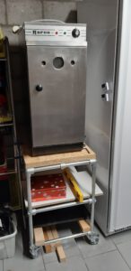 21 augustus 2021 –> Na jaren in de reguliere keukenoven te hebben gebakken was het tijd om over te stappen op een “echte” oven waarin ik meer dan 2 broden tegelijk kon bakken. Binnen de micro- bakkerij wereld wordt één merk als “de heilige graal” gezien en dat zijn de ovens van de Belgische fabrikant Rofco. Zij maken namelijk ovens met een stenen vloer, in verschillende afmetingen. En misschien wel het belangrijkste onderdeel; het heeft een zogenaamde 1- fase aansluiting. Dat wil zeggen dat je de oven in een gewoon huishouden kunt gebruiken, je steekt namelijk “gewoon” de stekker in het stopcontact en je kunt aan de bak! Dit in tegenstelling tot de echte bakkerij- ovens waarvoor je een 3-fase aansluiting moet hebben. Zelf heb ik het model “B20” tweedehands kunnen kopen in België bij een bakker die inmiddels een paar maten groter is gaan bakken. Ik heb de oven nu een dikke 3 maanden en hij bevalt uitstekend! Er passen 6 broden van 850 gram in en zelfs 9 van 600 gram! Naar mate ik meer ging bakken merkte ik dat het makkelijker werkt om de oven een stuk van de grond te hebben. Dus ging ik op aan het klussen en maakte zelf van steigerbuizen en een paar wielen een tafeltje. Nu nog op zoek naar een aantal mooie planken en we zijn alweer een stapje dichter bij een effectievere bakruimte!